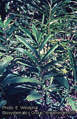 - Perennial, rhizomatous, aromatic herb; leafy stems 1–2 m tall; rhizome subterete, up to 1 cm in diameter, profusely branched, red-brown, covered with thin, subovate scales up to 6 cm × 4 cm and bearing thin, fibrous, pale brown roots; stem unbranched, mainly formed by the leaf sheaths, subterete, up to 1 cm in diameter but at base usually thickened up to 3 cm diameter.