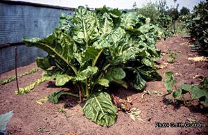Relatively large amounts of fertilizer are important for profitable yields. A normal application is 100 kg N, 50 kg P2O5 and 200 kg K2O per ha. Nitrogen can be given as NaNO3 in slightly acidic soils, or where available Na is limited. After picking the first leaves, a top dressing with sulphate of ammonia (for soils with high pH) or calcium ammonium nitrate (for soils with low pH) should be applied; this top dressing to be repeated every 4–6 weeks. Where boron deficiency causes stunted and slow growth, 10–30 kg/ha of borax can be applied. However, too much boron may be toxic to the subsequent crop. For good growth, moist soil is required. Irregular rainfall or inadequate irrigation may cause yellowing of leaves, or leaves that become coarse or bitter, whereas for garden beet it causes cracking of the roots.