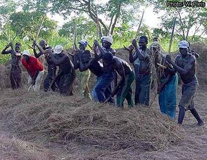 Fonio is normally threshed at about 8 days after harvesting, traditionally by beating or trampling. The husks remain on the grains, which therefore retain moisture and must be dried further. The grains are sufficiently dry when they run easily through the fingers. The product after threshing (‘fonio paddy’ or ‘raw fonio’) is further processed in 2 stages: husking (removal of the husks from the grains) and whitening (removal of the fruitwall and the germ). Husking and whitening are done manually and require 4–5 beatings with pestle and mortar, alternated with winnowing. To obtain a product of good quality, all dirt and sand must be removed by repeated washings. The processing cycle is difficult and time-consuming and efforts are being made to develop equipment that will make processing easier. Small-scale fonio processing enterprises can be found in towns, e.g. in Mali and Burkina Faso, aiming at urban and export markets.