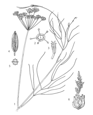 Fennel is often confused with dill (Anethum graveolens L.), which is closely related and easily crosses with fennel. Fennel and dill can be distinguished by their odour (fennel smells like liquorice, dill smells bitter and slightly pungent) and their ripe fruits (fennel has wingless fruits, dill fruits have a wide wing). Fennel plants without fruits may be recognized by their finely dotted stems, the longer and broader leaf-sheaths and the usually shorter secondary rays in the umbel.