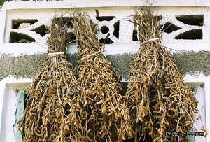 The whole plants are dried in the sun. They are then threshed by beating with sticks. The seeds are winnowed, cleaned and prepared for store or market. For on-farm storage a seed moisture content of 10–12% must be maintained. Deterioration of seed in storage is a major problem in the humid tropics and is attributable to poor storage conditions and pests. In the savanna region of West Africa producers have developed appropriate seed handling methods that ensure good seed germination when they save their own seeds.