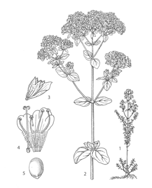 Origanum vulgare: 1, habit; 2, flowering branch; 3, bract and calyx; 4, corolla, stamens and pistil; 5, nutlet