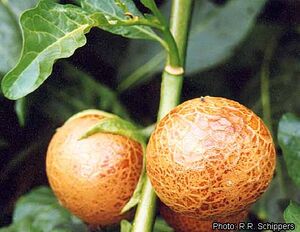 Certain cultivars are resistant to Cercospora solani, Thielaviopsis basicola (damping-off disease), Leucinodes orbonalis, Trialeurodes vaporariorum (whitefly), Amrasca biguttula (leaf hopper), and highly tolerant to Tetranychus urticae (spider mite) and Fusarium wilting. Cultivars having fruits with a tough calyx cover and high phenolic content are more resistant to fruit borers than those without. It was observed that gboma completely resisted shoot infestation of Leucinodes orbonalis, performing better than Solanum incanum L., which is well known for its resistance to this pest.