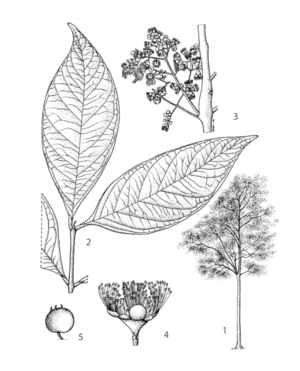 - A medium-sized tree up to 30 m tall with dense crown, bole up to 60 cm in diameter, bark surface fissured and scaly, grey.