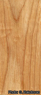 Le bois de cœur est brun jaunâtre ou brun rougeâtre, souvent avec une nuance dorée, et il est nettement distinct de l’aubier qui est jaune pâle ou blanc et a 7–10 cm de large. Le fil est droit ou contrefil, le grain moyen à grossier. Les surfaces sciées sur quartier sont souvent rubanées.