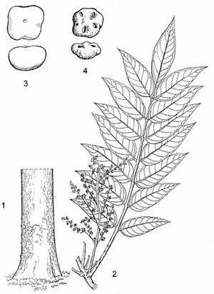 - Feuilles disposées en spirale, groupées près de l’extrémité des branches, composées imparipennées à 5–8 paires de folioles ; stipules absentes ; pétiole et rachis mesurant ensemble 20–40(–50) cm de long, rougeâtres, poilus ; pétiolules de 2–3 mm de long, sillonnés ; folioles opposées, étroitement ovales à oblongues-lancéolées ou oblongues-elliptiques, de 6–16 cm × 2,5–4,5 cm, arrondies à légèrement cordées et asymétriques à la base, acuminées à l’apex, papyracées, glabres à l’exception parfois du dessous des nervures, pennatinervées à 10–14 paires de nervures latérales.