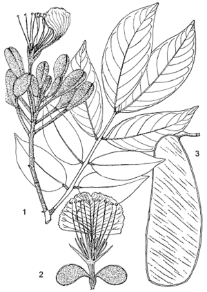 - Fruit : grande gousse ligneuse, oblongue, aplatie, atteignant 30 cm × 7 cm, à court stipe, à denses poils courts et dorés, brun jaunâtre à brun, à veines diagonales indistinctes, déhiscente par 2 valves, à environ 4 graines.