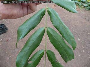 - Feuilles alternes, composées paripennées à (3–)6–12(–13) paires de folioles, retombantes ; stipules étroitement oblongues, caduques mais à base persistante ; pétiole de 1–3 cm de long, rachis de 15–28 cm long, à pubescence rougeâtre ; folioles opposées, presque sessiles, elliptiques à lancéolées, de 1,5–12 cm × 0,5–4,5 cm, arrondies mais fortement asymétriques à la base, obtuses à faiblement émarginées ou courtement acuminées à l’apex, coriaces, à poils denses et brunâtres lorsque jeunes, mais devenant presque glabres, à 2–3 nervures presque basales sur un côté de la foliole et à 4–6 paires de nervures latérales.