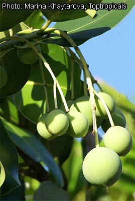 - Fruit : drupe globuleuse à obovoïde de 2,5–5 cm de long, lisse, vert grisé, à 1 graine.
