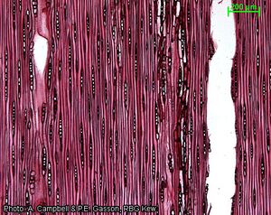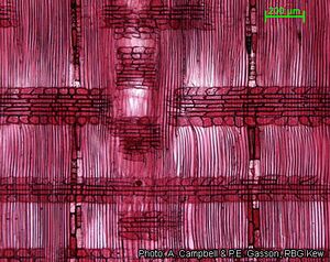 - Parenchyme axial : 76 : parenchyme axial en cellules isolées ; (85 : parenchyme axial en bandes larges de plus de trois cellules) ; 86 : parenchyme axial en lignes minces, au maximum larges de trois cellules ; 93 : huit (5–8) cellules par file verticale.