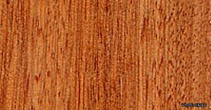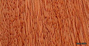 Le bois de cœur est rosé à brun rougeâtre, et distinctement délimité de l’aubier pâle. Contrefil, fil spiralé ou ondulé, grain moyennement grossier et irrégulier. Surface lustrée au rabotage ; présence d’un motif en rayures sur la surface radiale, et de marques en zigzag de couleur plus sombre sur la surface tangentielle.