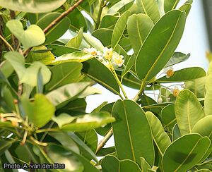 - Feuilles opposées décussées, simples et entières ; stipules absentes ; pétiole de 1–2 cm de long ; limbe elliptique, ovale, obovale ou oblong, de (5,5–)8–20(–23) cm de long, arrondi à cunéiforme à la base, rétus à obtus à l’apex, coriace, à nervures secondaires parallèles très rapprochées et alternant avec les canaux à latex.