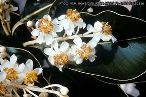 - Fleurs bisexuées, régulières, agréablement parfumées ; pédicelle de 1,5–4 cm de long ; tépales 8(–13), obovales, d’environ 1 cm de long, blancs ; étamines nombreuses, en 4 faisceaux, légèrement connées à la base, jaune-orangé ; ovaire supère, globuleux, 1-loculaire, style long et élancé, flexueux, stigmate pelté.