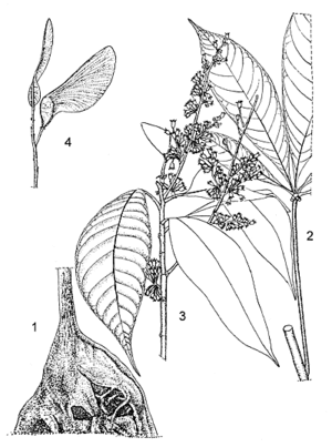 - Fruit formé de 1–6 nucules ligneuses d’environ 2,5 cm × 1,5 cm, pourvu d’une grande aile d’environ 8 cm × 3 cm.