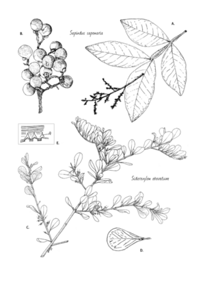 Planche 224 : SAPINDACEAE. VIII. Sapindus saponaria. A. Rameau. B. Fleurs. C. Fruits. SAPOTACEAE. I. Sideroxylon obovatum. D. Rameau. E. Feuille. F. Écorce (coupe transversale).